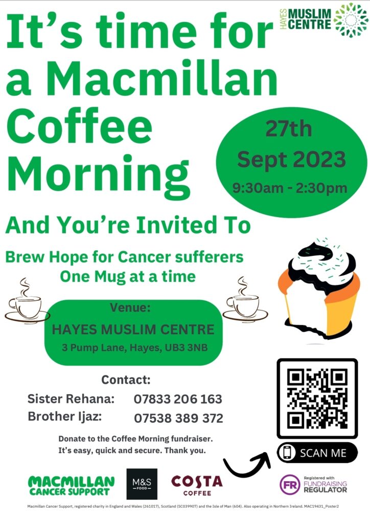 Hayes Muslim Centre is organising a coffee morning event “MACMILLIAN COFFEE MORNING – FUNDRAISING FOR CANCER RESEARCH” in partnership with Macmillan Cancer support.