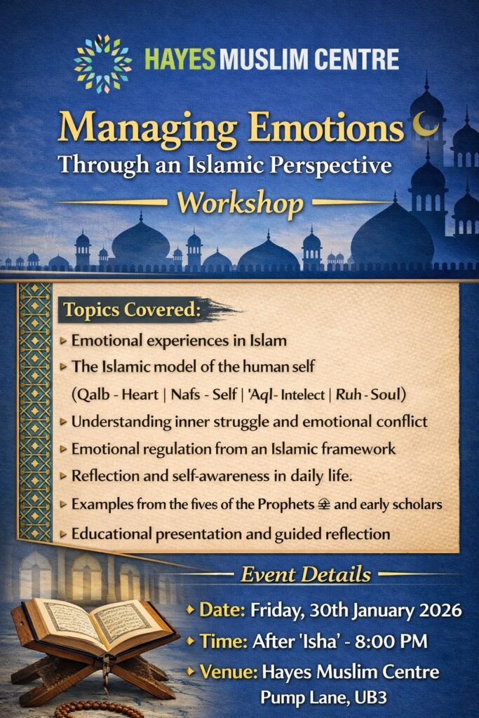 Hayes Muslim Centre is pleased to invite brothers and sisters to a beneficial workshop focusing on understanding and managing emotions through the lens of Islam, lecture is delivered by Shaykh Athar Mahmood (Imam / Muslim Chaplin).