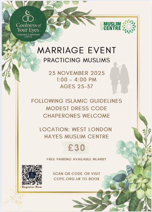 Hayes Muslim Centre is organising an “Marriage Event” in partnership with Coolness of Your Eyes.