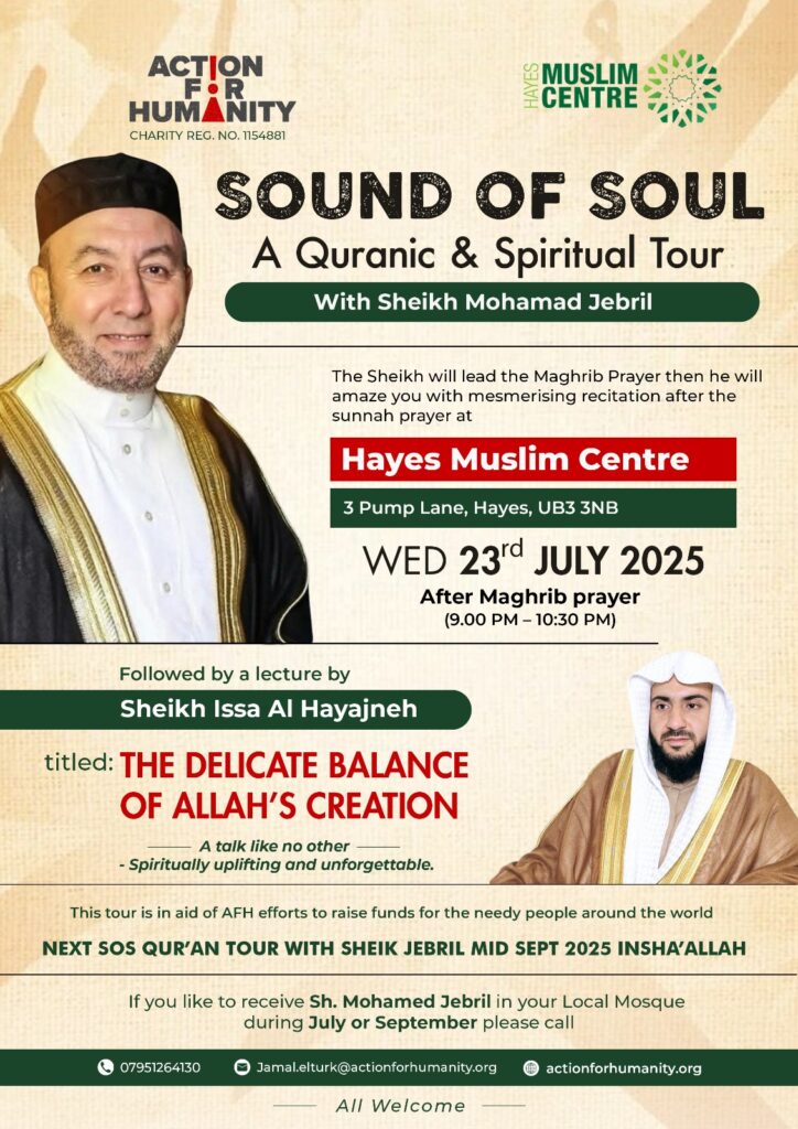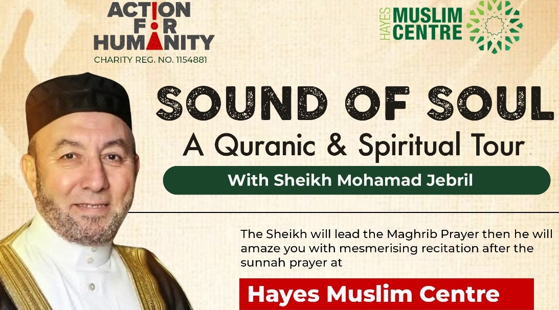 Hayes Muslim Centre is organising a very Spiritual Quranic tour event “Sound of Soul” in partnership with Action For Humanity.